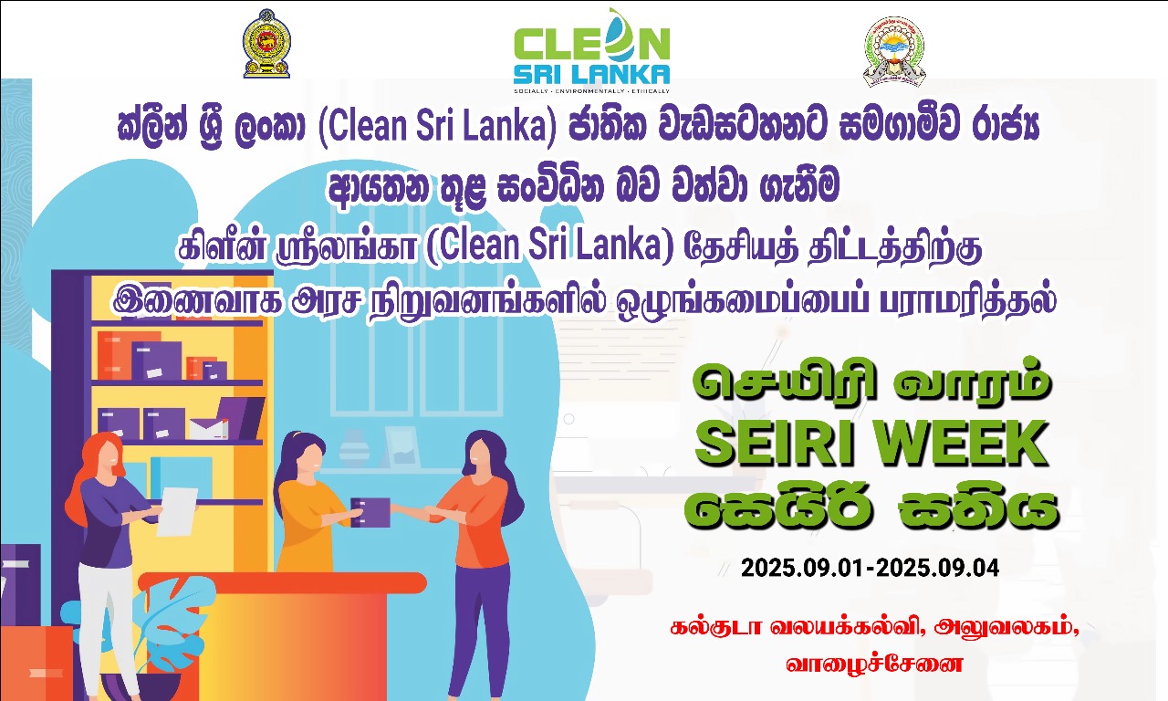 'க்ளீன் ஸ்ரீ லங்கா (ஊடநயn ளுசடையமெய)' தேசிய வேலைத்திட்டத்துக்கு இணையாக அரசாங்க நிறுவனங்களில் ஒழுங்கமைப்பை பேணுவதற்காக 'செயிரி வாரம்' செயற்படுத்தல்.
